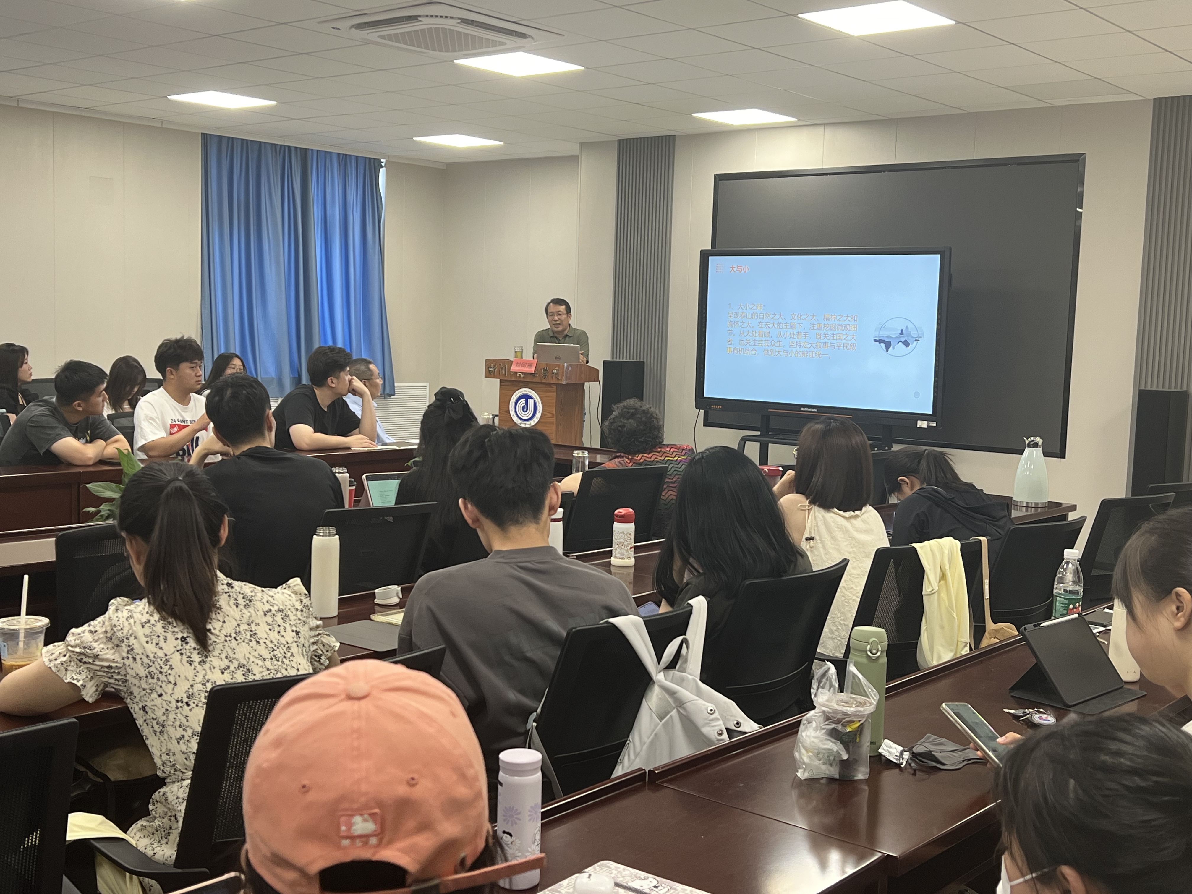 刘何雁以他担任执行总导演的《大泰山》《新沂蒙》等优秀鲁制纪录片为切入点,对其艺术特色、创作经验进行深入分析。一部部生动的作品彰显着齐鲁文化品格,传递家国情怀,使主旋律的形象表达贯穿其中,用视觉形象化的表达实现历史与现实的对话。刘何雁以深厚的理论素养与丰富的实践经验,通过倾情讲解使同学们对于纪录片的本质理念和创作手法以及中华文化的传承与发展产生了更深刻的思考。